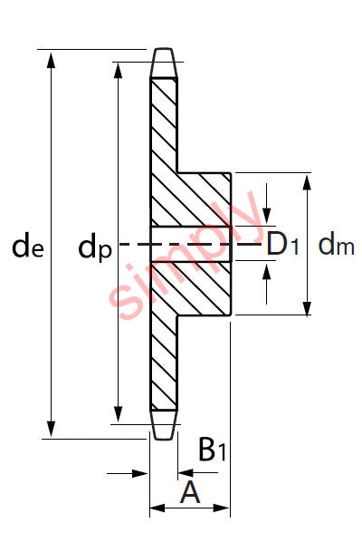 Pilot Bore Double Simplex Sprockets: Small sprockets are usually manufactured from C45 Steel and the large sprockets maybe supplied in G22 Cast Iron. These Pilot Bore Double Simplex Sprockets allow the end-user to machine the bore to suit their own application. The bore would then require a key way to be broached and threaded holes made through the boss to secure the sprocket to the shaft. The nominal pilot bore is purely to permit tooling to be used to machine the bore to size and should not be taken as a shaft sized finish. Benefits: Universal on the shelf stock - can be machined to suit the application. Durable and Hard wearing. |